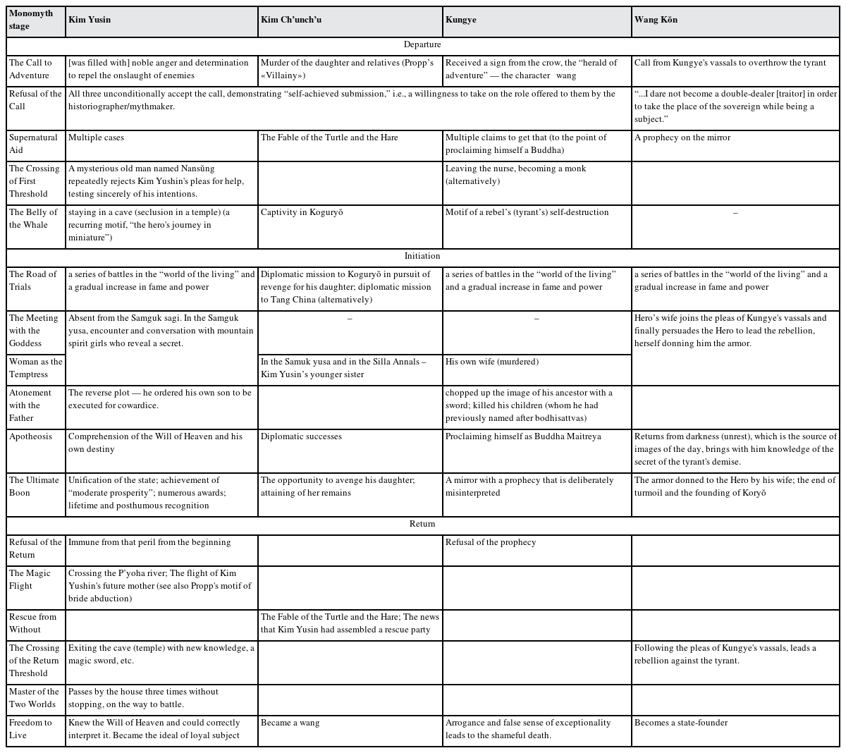 Keywords: archetype, myth, historiography, Samguk sagi, Hero’s Journey, Transformations of the Hero, cosmogonic cycle, Kim Yusin, Kungye