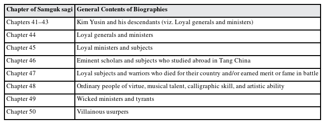Yet, “Confucian rationality” by no means prevents heroization, that is, the construction of images or functional archetypes (more on that in the next section). Kim Seung-ho emphasizes that Kim Pusik constructs the heroic figure of Kim Yushin 金庾信 (595-673) by demonstrating didactic conformity of his character’s actions to the “five moral principles” 五倫 relative to the sovereign, the state, and the family