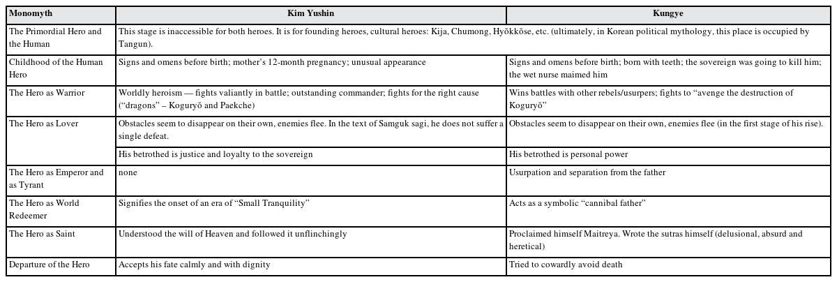 Keywords: archetype, myth, historiography, Samguk sagi, Hero’s Journey, Transformations of the Hero, cosmogonic cycle, Kim Yusin, Kungye